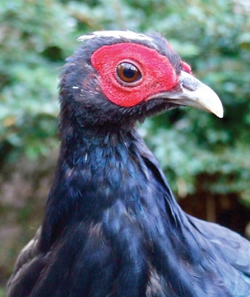 - Adults are about half the size of wild turkeys, with the male having distinctive all-black plumage with a blue gloss and metallic fringes, white crest and red skin around the eyes.