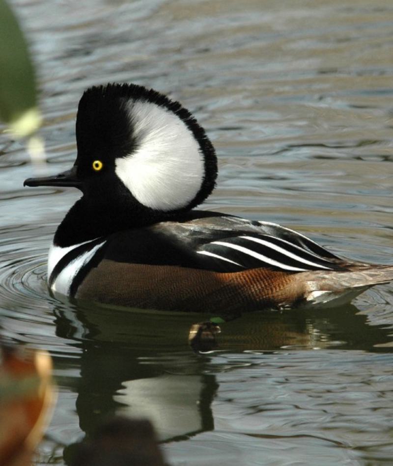 Like other diving ducks, the legs of hooded mergansers are located farther back on its body than those of ducks that stay on the surface. This trait helps make them expert divers. Hooded mergansers have a distinctive head crest that fans into a round half circle atop their heads. The crest is used to attract mates.
