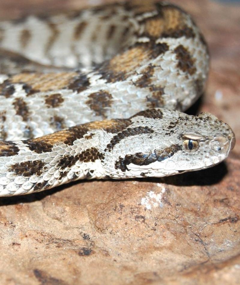 This mountain-dweller occupies dry, warm slopes where temperatures fall at night. It's usually only active during the day. Its pattern of orangish-brown spots helps the snake blend in with its surroundings.