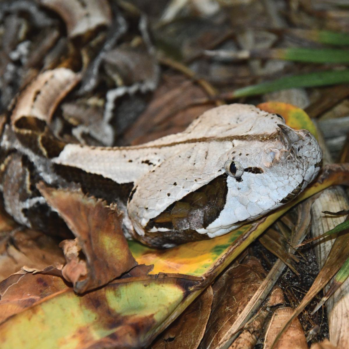West African Gaboon vipers are the largest true viper species. They are able to reach lengths of over six feet and often weigh over 40 pounds. Their fangs grow to be about two inches long. Their leaf-shaped heads and beautiful coloration provide wonderful camouflage as they sunbathe to warm up, half-buried in the debris of the forest floor. Gaboon vipers are venomous but they rarely bite, even when stepped on. If disturbed, it startles and warns potential enemies by forcibly exhaling air through its nostrils.