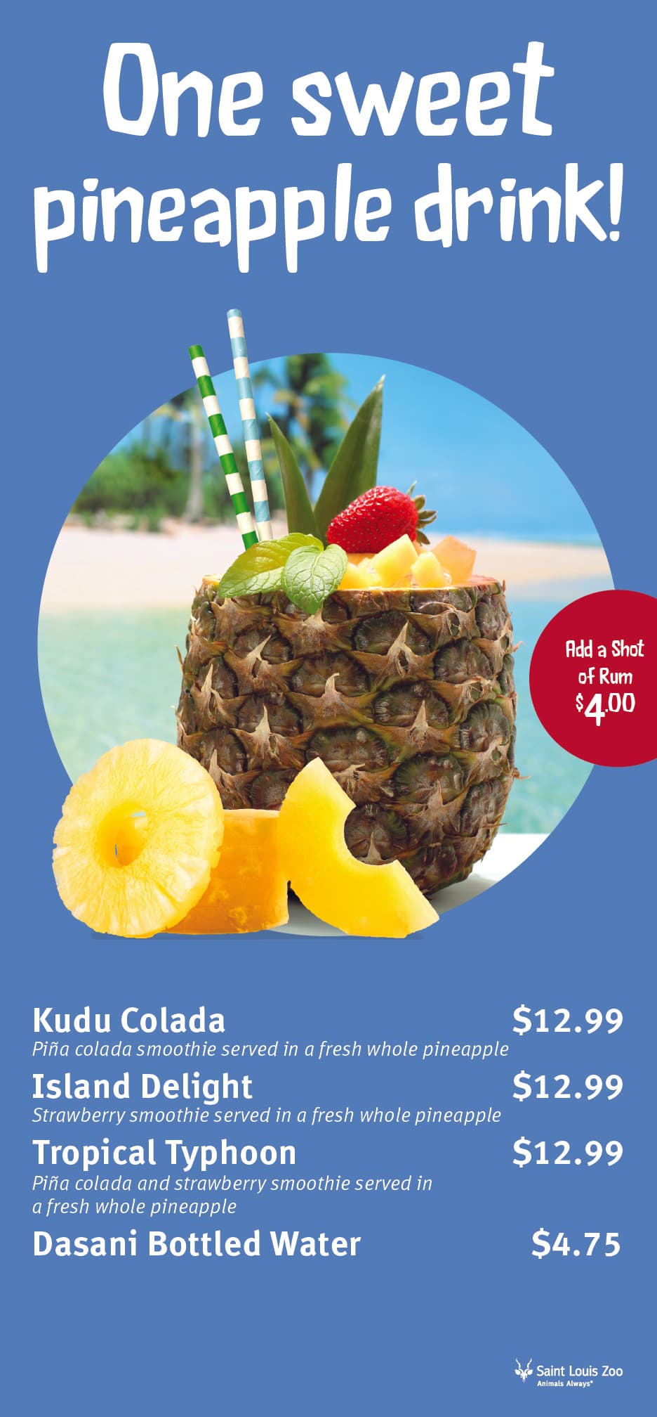 Enjoy a fresh-made fruit smoothie served in a fresh-cut pineapple. Those age 21+ can add a little exotic flare with assorted alcohol options.