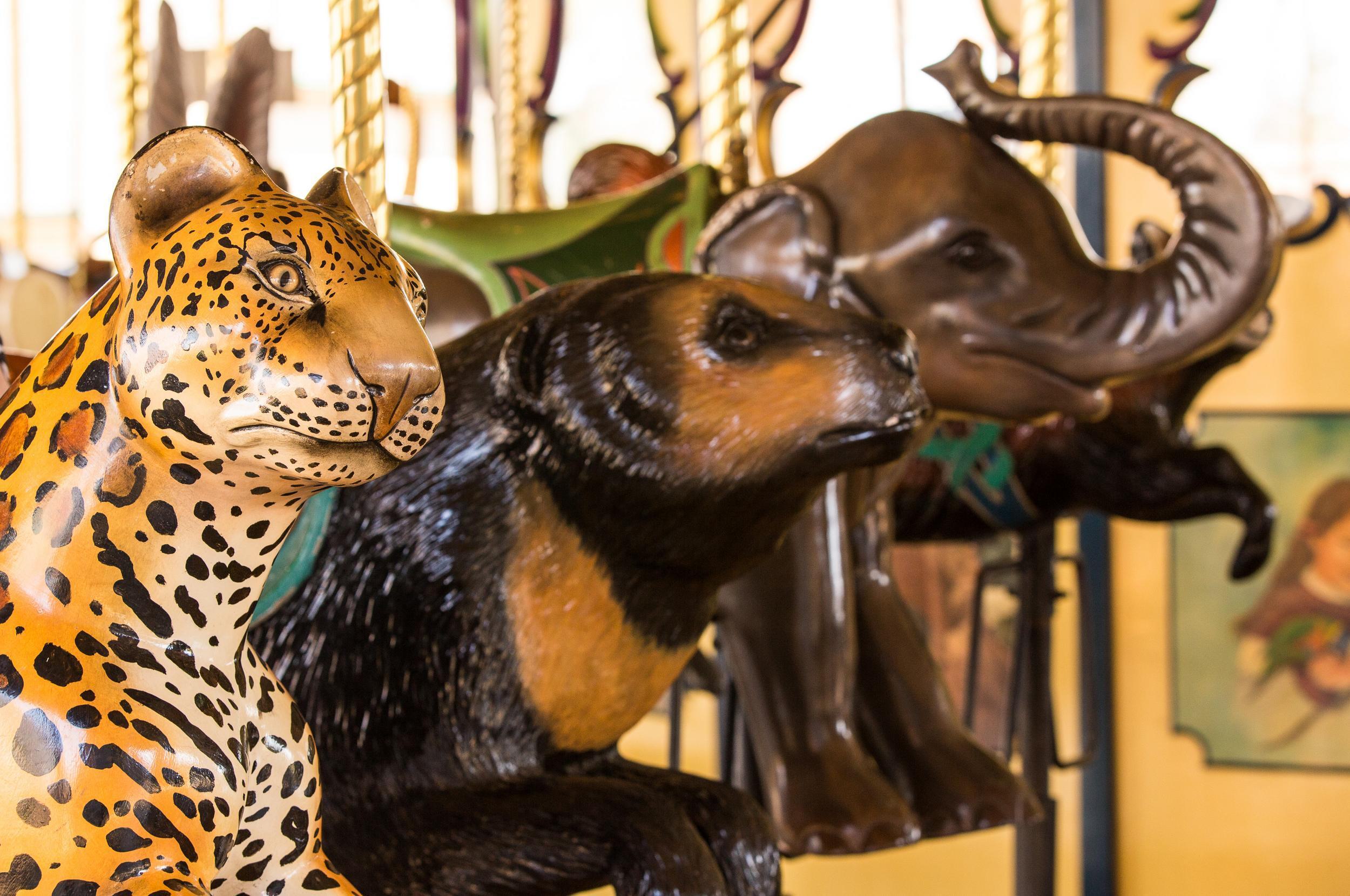 The Conservation Carousel features 64 colorful hand-carved wooden animals, representing protected and endangered species at the Saint Louis Zoo. It's hard to decide whether to climb on a cheetah, warthog, hippo, polar bear, Grevy's zebra, Humboldt penguin or other exotic figures.